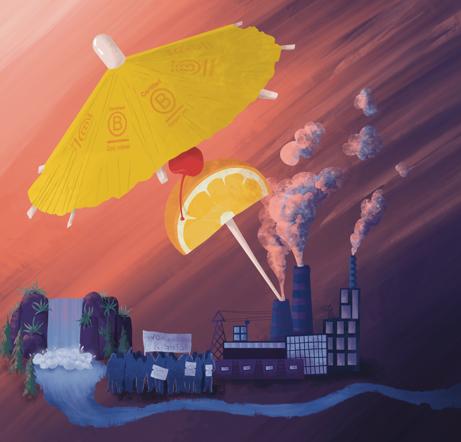 Two full-page illustrations for Full Pour Magazine - an article about B Corp businesses, written by John deBary.